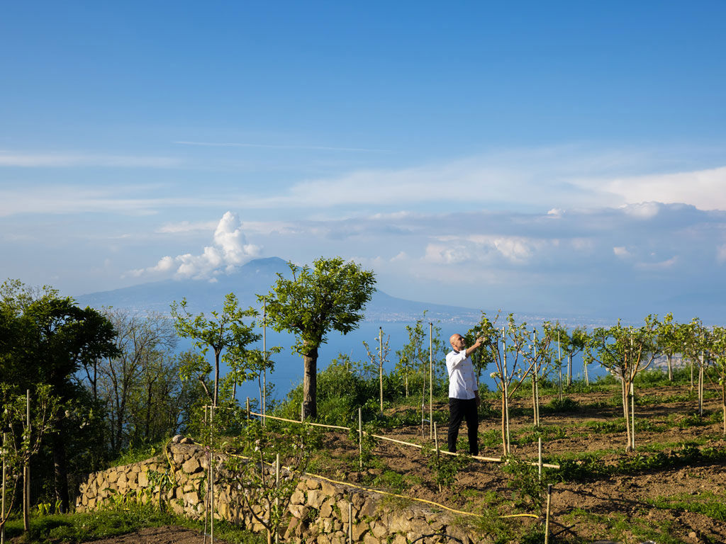 L’accogliente sala affaccia sul parco di oltre 20.000 mq che circonda l’albergo mentre sullo sfondo si può ammirare l’azzurro del Golfo di Napoli e la maestosità del Vesuvio.